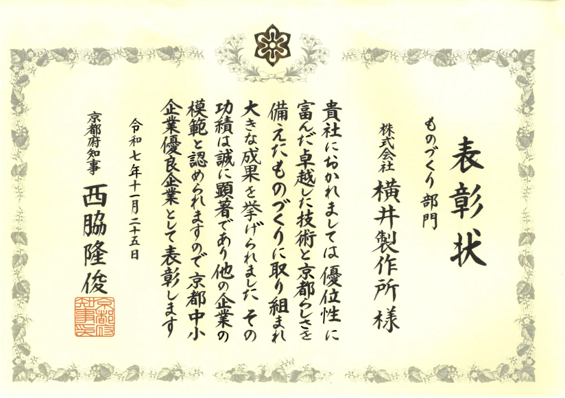 京都産業の振興に貢献している中小企業を表彰する「京都中小企業優良企業表彰」のものづくり部門を受章致しました。